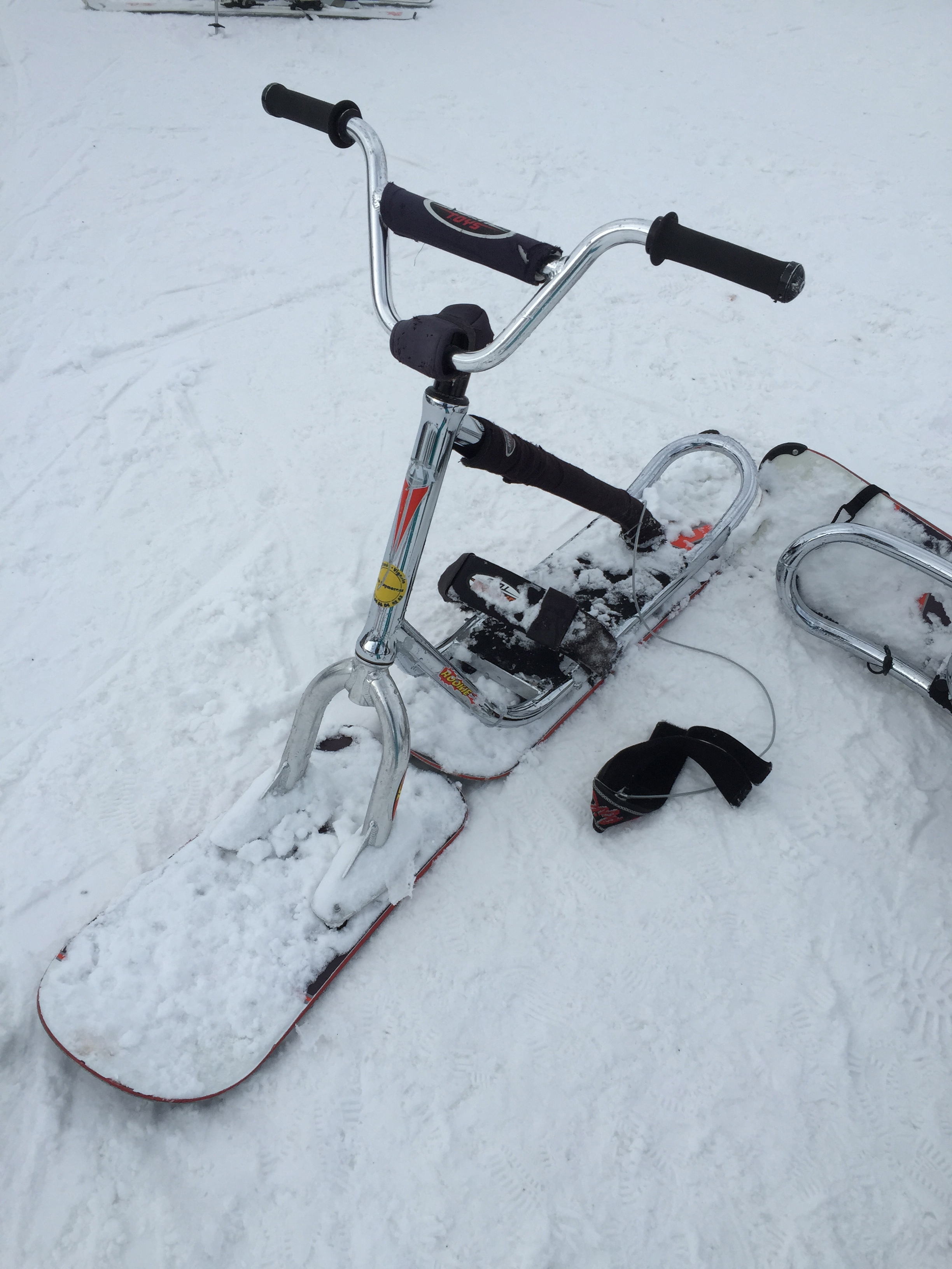 Qué es el snow scoot? Es cómo una bicicleta adaptada al snowboard. La tabla es similar a la de snowboard y ésta se divide en dos partes. La parte delantera es más corta y lleva el manillar.