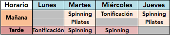 Una de mis profesiones son las actividades dirigidas cómo spinning, pilates, tonificación, etc. Es por ello que me mantengo más o menos en forma. Digo más o menos porqué cómo veréis en el horario que os he colgado más a bajo «únicamente» (comparado con otros técnicos de actividades dirigidas pueden hacer más de 5 clases al día) hago entre 1 o 3 sesiones al día (4 días a la semana).