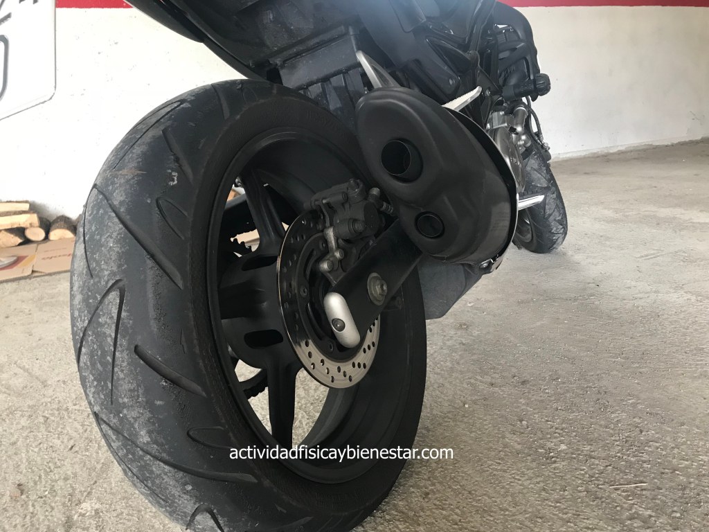 La primera duda que tuve fue sobre el estado de mis neumáticos. Les faltaba poco para renovar y cambiarlos. No sabía si iba a repetir la experiencia en el circuito, y no quería gastarme dinero en unos neumáticos mixtos para motos (para carretera y para circuito) porque son un poco más caros y si no los iba a utilizar pues vaya tontería… Así que decidí ir con los viejos y quemarlos para que cuando acabase, los renovaría.